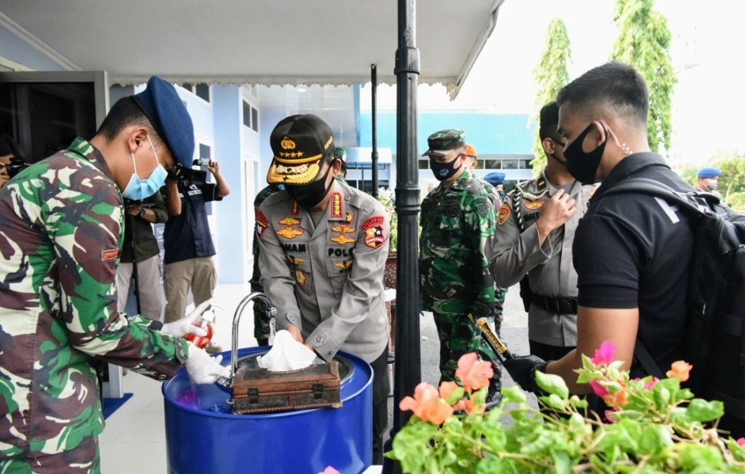 Sebelum memasuki Ruang VIP Pandawa terlebih dahulu Panglima TNI dan Kapolri beserta rombongan dilakukan protap protokol kesehatan, seperti mengukur suhu tubuh dan hand Sanitiser.