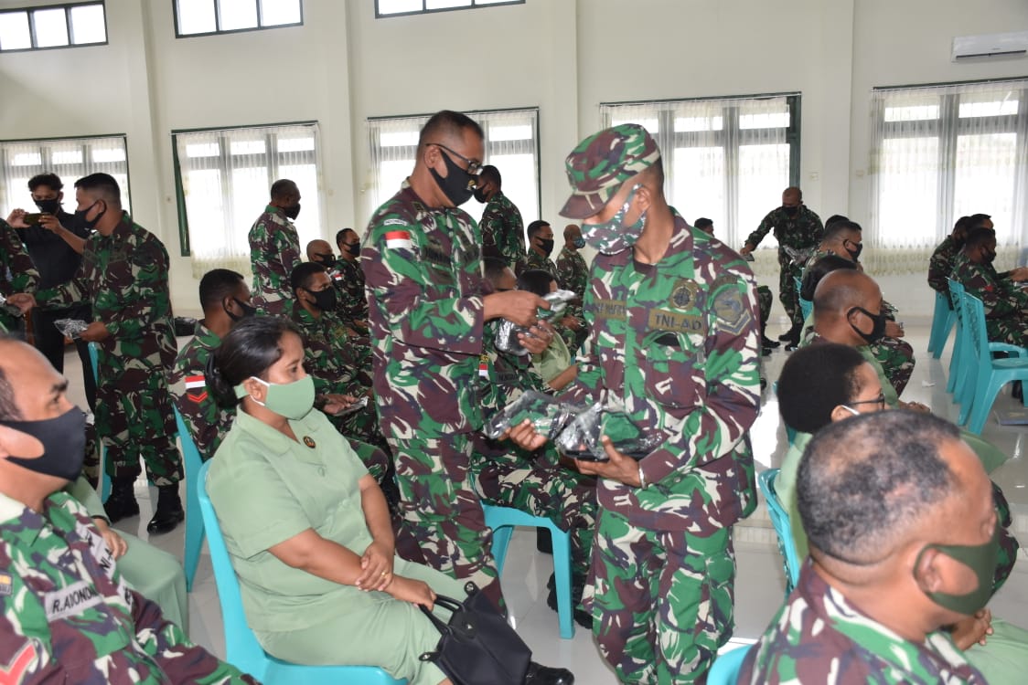 Sebelum memberikan pengarahan, Danrem Merauke bersama Ketua Persit KCK Koorcab Korem 174/ATW Ny. Renny Bangun Nawoko dan rombongan membagikan masker kepada seluruh prajurit dan Ibu-ibu Persit KCK Kodim 1711/Boven Digoel.