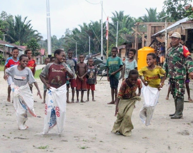 Merauke-Prajurit TNI dari Kodim 1707/Merauke yang tergabung dalam Satuan Tugas TNI Manunggal Membangun Desa (Satgas TMMD) ke-107 menghibur anak-anak dengan menggelar perlombaan balap karung di pedalaman tepatnya di Kampung Epem, Distrik Citak Mitak, Kabupaten Mappi, Provinsi Papua, ,Senin (7/4/2020).